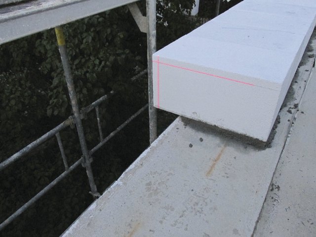 Správnému výškovému vyrovnání každé tvarovky s přesností ±1 mm je třeba věnovat velkou pozornost, abychom mohli na následující druhou a další vrstvy obvodového zdiva aplikovat maltu pro tenké zdění, kterou každý výrobce přesných obvodových tvárnic dodává jako jaho systémovou součást. V naší obrazové dokumentaci se přesnost pokládky kontroluje laserovým paprskem.