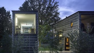 Opláštění, obklad z průhledných akrylátových panelů, je jednoduše upevněno na kostru z měkkého dřeva, čímž vzniká zajímavý detail s obnaženou konstrukcí. Velká zapuštěná okna umocňují subtilní vzhled stavby přitom rámují poutavé výhledy ven i dovnitř. Interiéry obou domů jsou provedeny ve zredukované a základní paletě materiálů; dřevotřískovými deskami, dřevěnými trámy, překližkou, surovým kovem a pryží. Dokazuje to, že ta nejlepší architektura nemusí být ani zdaleka nejdražší. Přes zdánlivou sofistikovanost, kterou na nás mohou působit složité půdorysy a řezy, může být tento dům snadno považován za prototyp svého druhu, a to především kvůli své přizpůsobivosti plánu, situaci a měřítku. Jedná se o systém, který může být dle potřeby pozměněn tak, aby sloužil jednotlivci, rodině či městu.