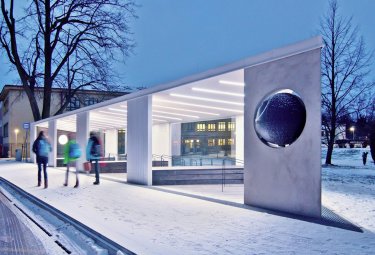 Jedno město, stovky cestujících, jeden přístřešek - objekt zářící, o čase informující a před deštěm, větrem, sněhem a sluncem nejen cestující, ale i historii chránící.